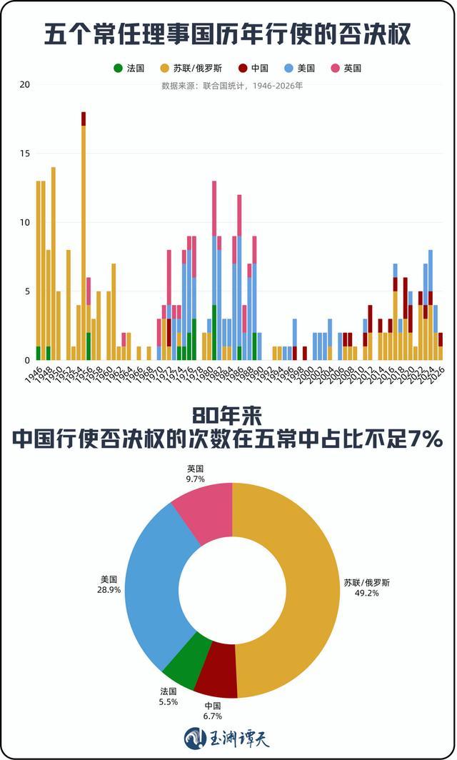 中国上一次行使否决权是在两年前,美国提出加沙停火决议草案的时候。根据联合国统计,历史上329次否决中,中国只占22次,占比不足7%。
